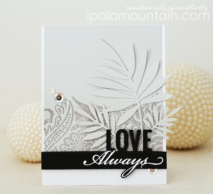 I love this sketch and how versatile it is! I used a Wendy Wecchi Metallic Silver Embossing Paste with a Memory Box Rhapsody stencil, for a subtle background, over which I layered a magnificent Hero Arts Palm Fancy Die. I’ve been a long time fan of their Three Ferns stamp and when the coordinating die came out, I didn’t hesitate for a moment. It was just waiting for the right card to be used on!