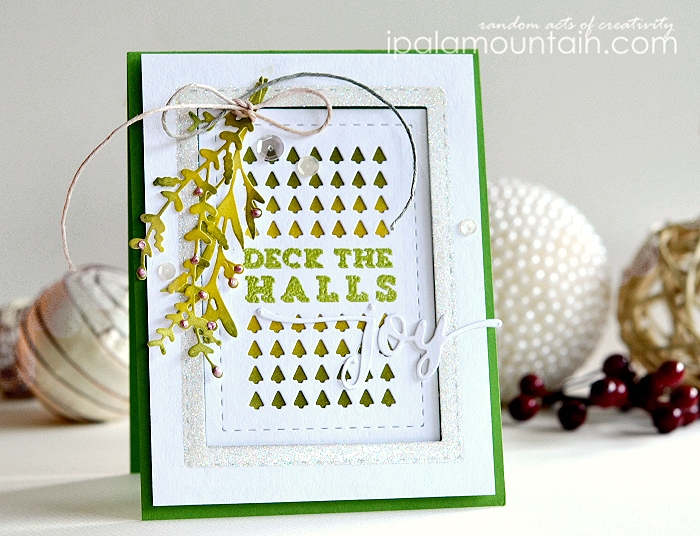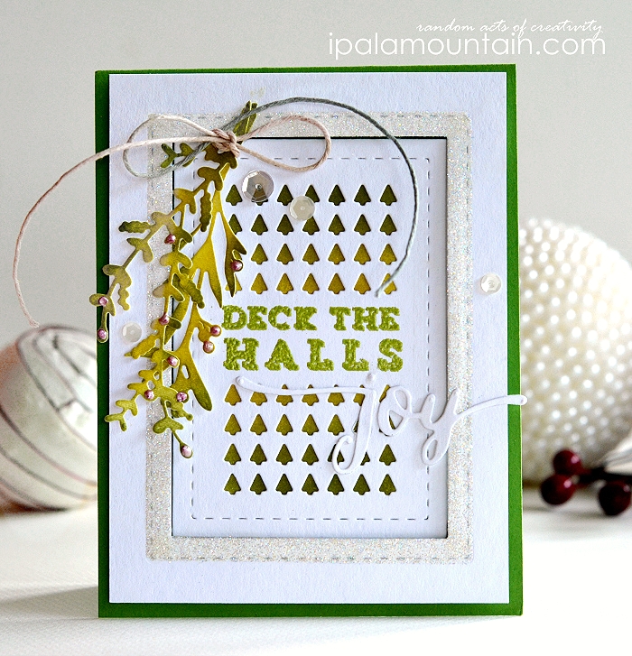 I made a few cards featuring a variety of product from the release and I will be sharing more soon. For the first card, I used all of the pieces in the Holiday Apertures Designer Dies, making a recessed window which I matted with cardstock blended with two shades of green Distress Inks, thus creating a lovely ombre effect behind the teeny tiny die cut trees. I popped up the outer frame, after I applied a glittery edge to it (by sprinkling loose glitter over a strip of double-sided tape).