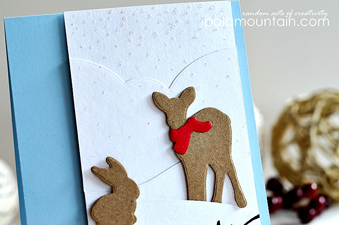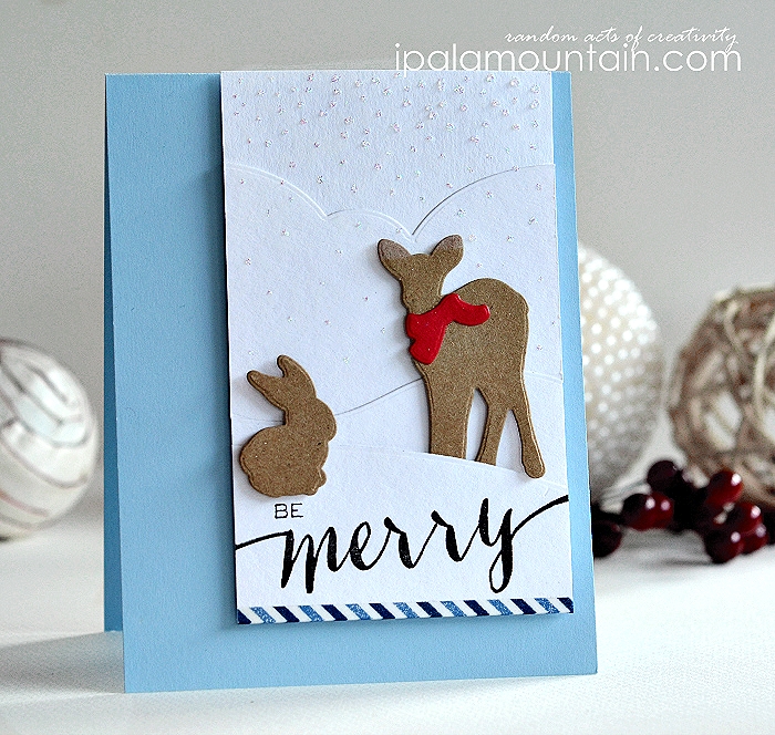 Finally, here’s a card featuring the sweet animal silhouettes from Winter Woodland Companion Die (don’t you just love the scarf on the deer??), the Landscape Borders Designer Dies and the sentiment from the Hand Lettered Holiday stamp set. I kept the scene white-on-white, with glittery “snow” only and contrasting silhouettes against it.