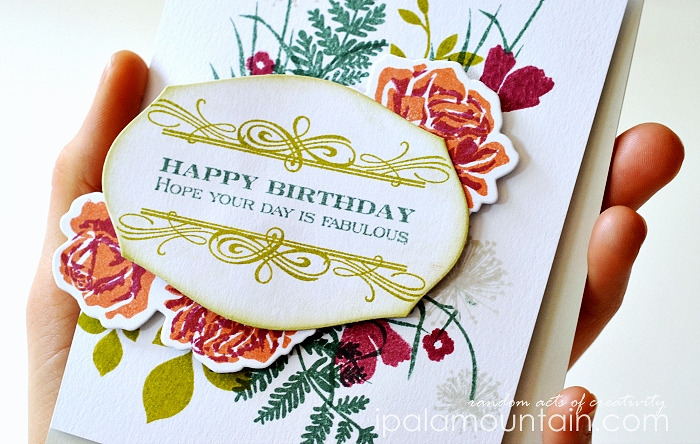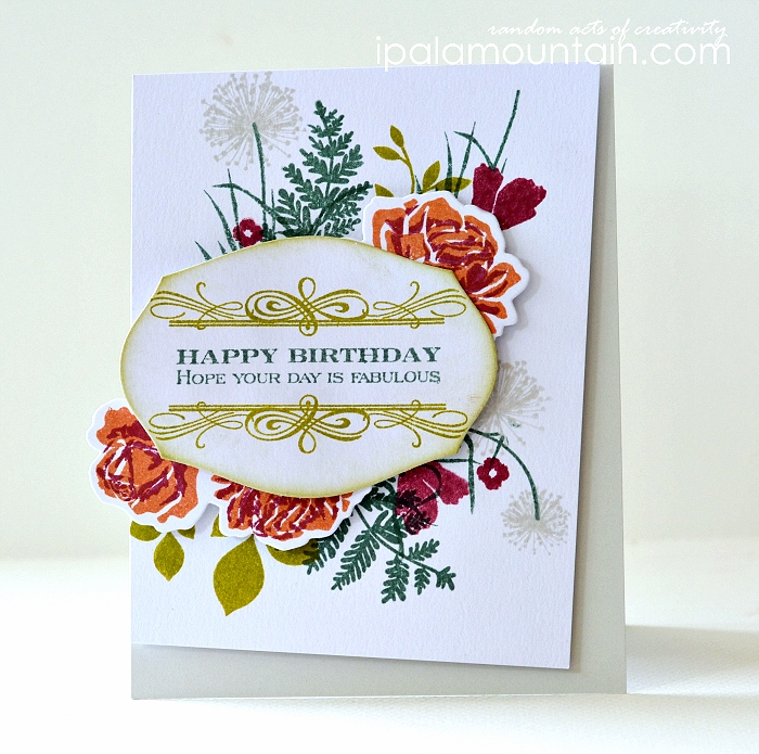 It’s a similar card to the one I shared previously, with a Soft Stone base and pops of colour against the white panel, on the loosely put together floral arrangement. It’s what I feel most comfortable with. What I don’t feel comfortable with is how whenever I create a PTI - oriented card, I find my stash outdated and inadequate. Funny how I seem to have quite a few stamp sets, cardstock and inks, but the stamps, if any, I acquire always after long months of eyeing them, when the rest of the stamping community regards them as old and boring and happens to sell their personal stash for half the price. LOL