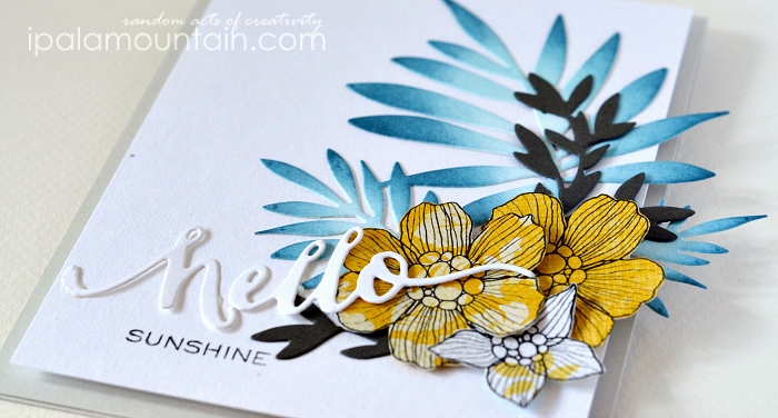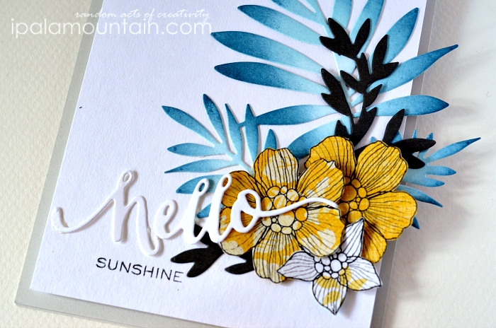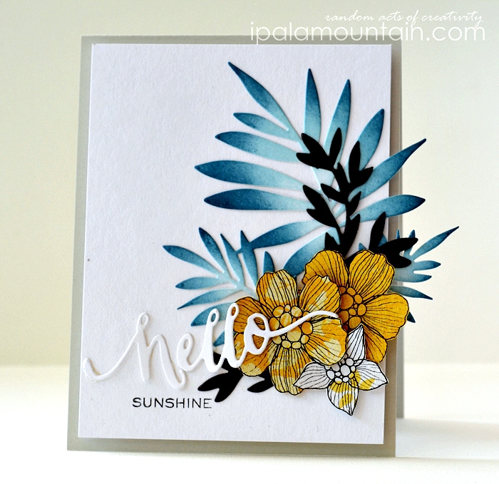 I arranged them in a cluster on a white cardstock panel, along with the fern. I then placed the sentiment across the left side, mixing the WPlus9 Hand Lettered Hello die with the matching stamp set. Lastly I die cut the branch from dark grey cardstock, with WPlus9 Foliage Frame die and tucked it behind the cluster. The panel was adhere to the PTI Soft Stone card base.