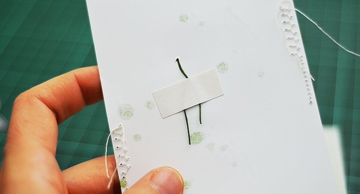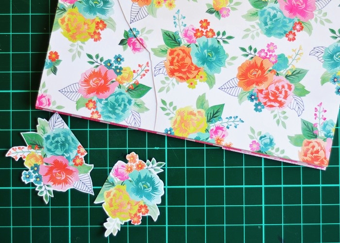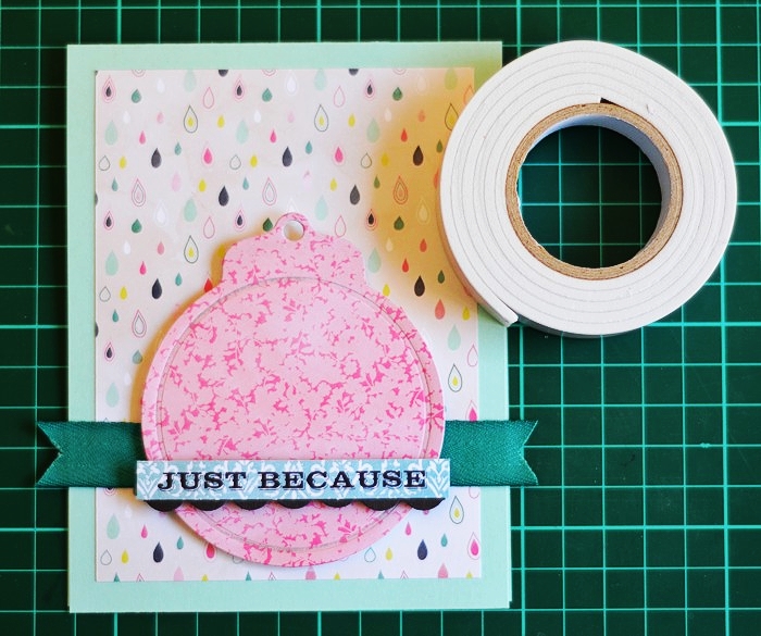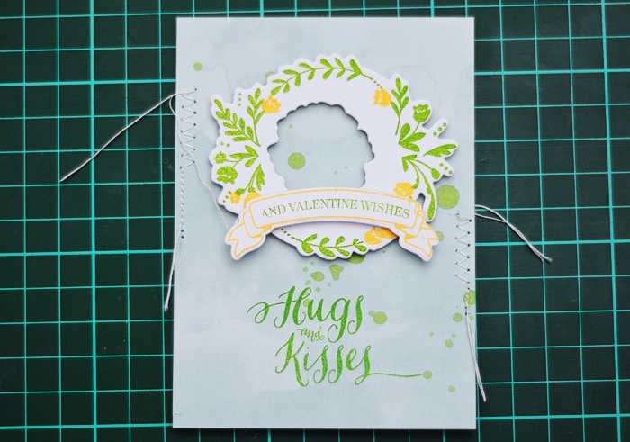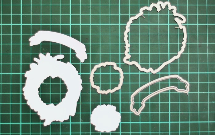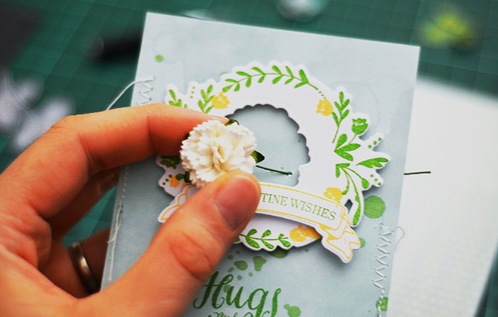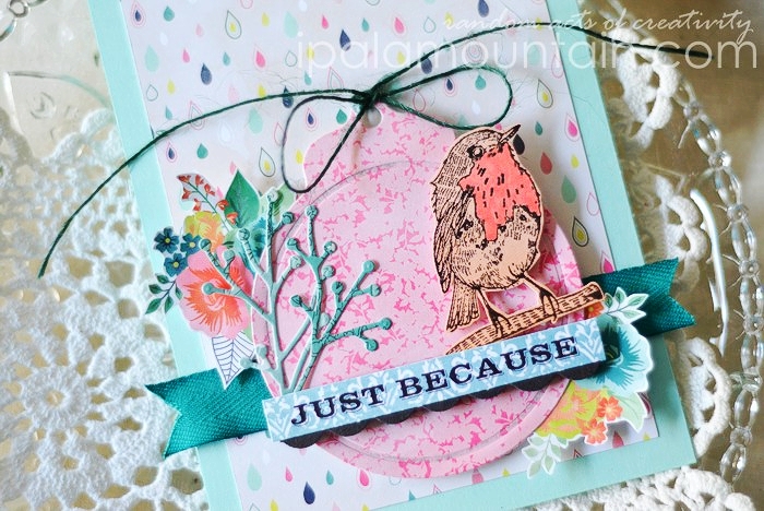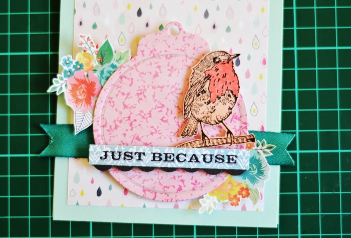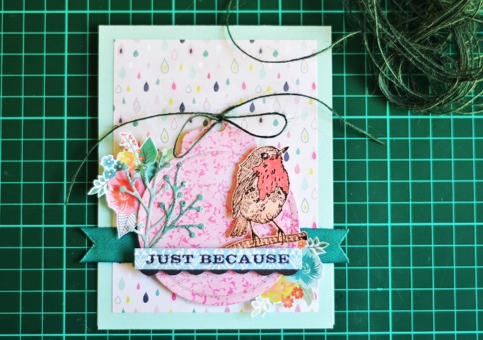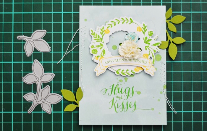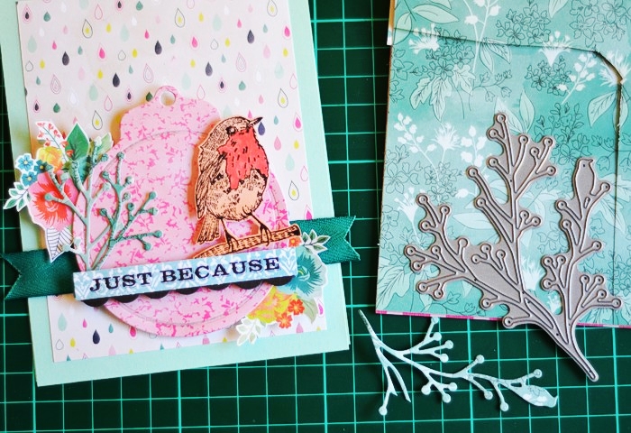 Next I used my favourite, realistic branch die from Under The Mistletoe die set, to add a deep teal element to the card which compliments the flowers on the wreath. The choice of the colour to go with pink & peach on my card, came from the paper pad I used but I ended up adding it in other ways myself.