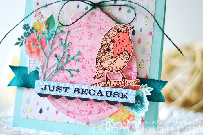 Then I die cut another banner in smaller size and stamped the sentiment from Fanciful Feathers. I placed the banner across the card using dimensional tape, like I did for the wreath, and covering the unsightly parts of the clustered leaves.