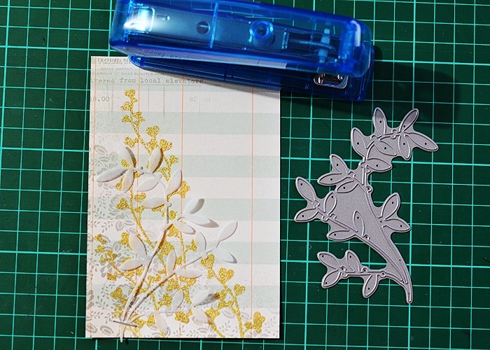 I mounted the wreath on the card and clustered some vellum leaves on its side, which I die cut with Simon Says Clustered Leaves die.