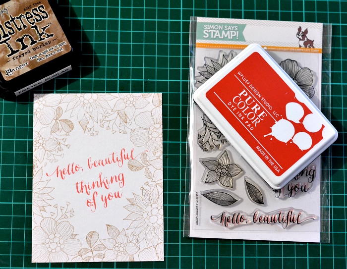 I started by choosing the perfect spot for the sentiment, and so I stamped it first. Then I chose a semi-light brown of Frayed Burlap Distress Ink to arrange the flowers and leaves around the card.