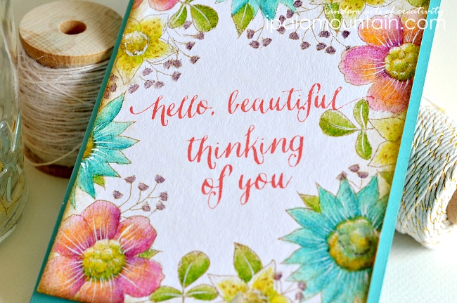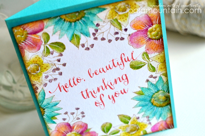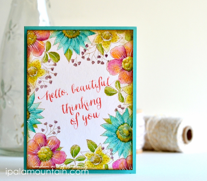 Here’s a better view of the inspiration, a watercolour poster from Wildfield Paper Co. (see it HERE). I’ve seen cards with floral design arranged around the central sentiment many times before, and don’t ask me why I waited this long to recreate one myself… Once I saw that poster I knew this is the one to kick start my mojo.