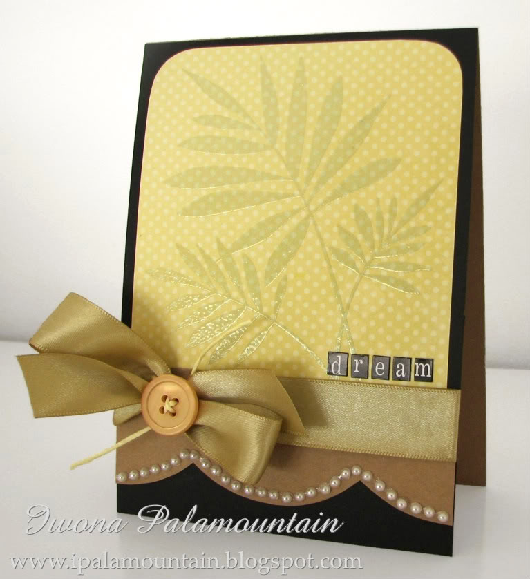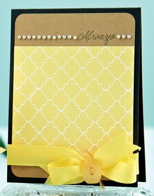 Supplies: cardstock: Quill; paper: Quill, Kaisercraft; stamp: Hero Arts; ink: VersaMark; clear embossing powder: Hero Arts; ribbon: Sullivans; pearls: Michaels; letter stickers: Fynmark; button & twine: stash