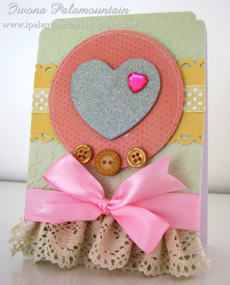 Supplies: cardstock: Quill, DCWV; papers: Grant, Kaisercraft Penny Royale; chipboard heart: Bella!; Cuttlebug & Houndstooth embossing folder; Fiskars border punch; sewing machine; buttons, ribbons, lace, rhinestone heart: stash