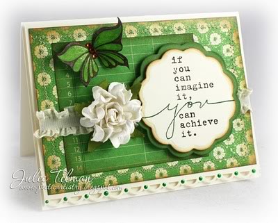 On my inspired card, I concentrated on the lovely green tones, but paired them with rich browns & kraft, instead of white as Julee did. My card is almost all stamped. I love creating my own DP, but I’d normally give it up to the gorgeous papers. Not this time