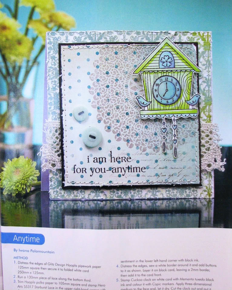The papers are by Glitz Design (Hoopla), and the stamps by Hero Arts. You can find the card, along with the instructions, on page 25 of the magazine.
