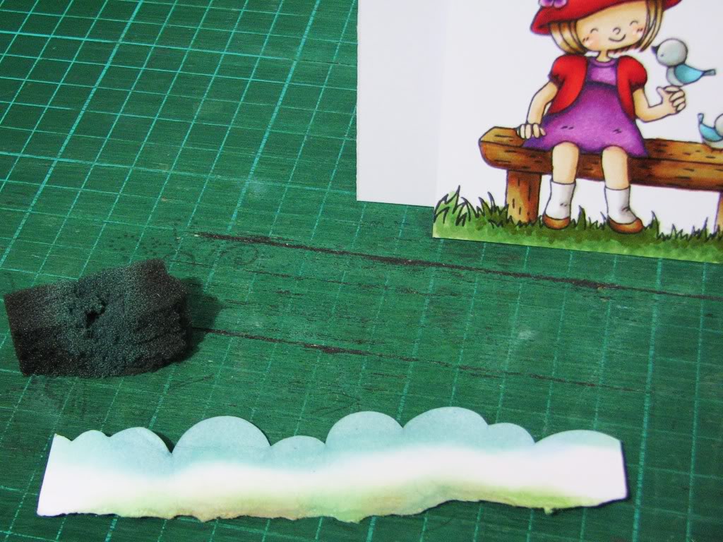 There’s many ways to do it, some of the common ones include using punched/die cut scalloped shapes, to sponge around. We all know that the clouds in nature show nothing near the regularity of the punched scallops, thus I like to use the template that follows a more random pattern.