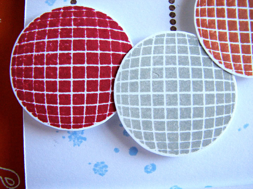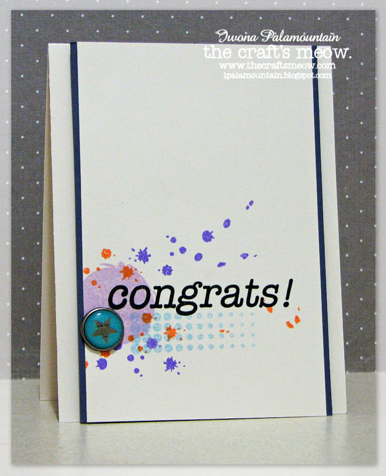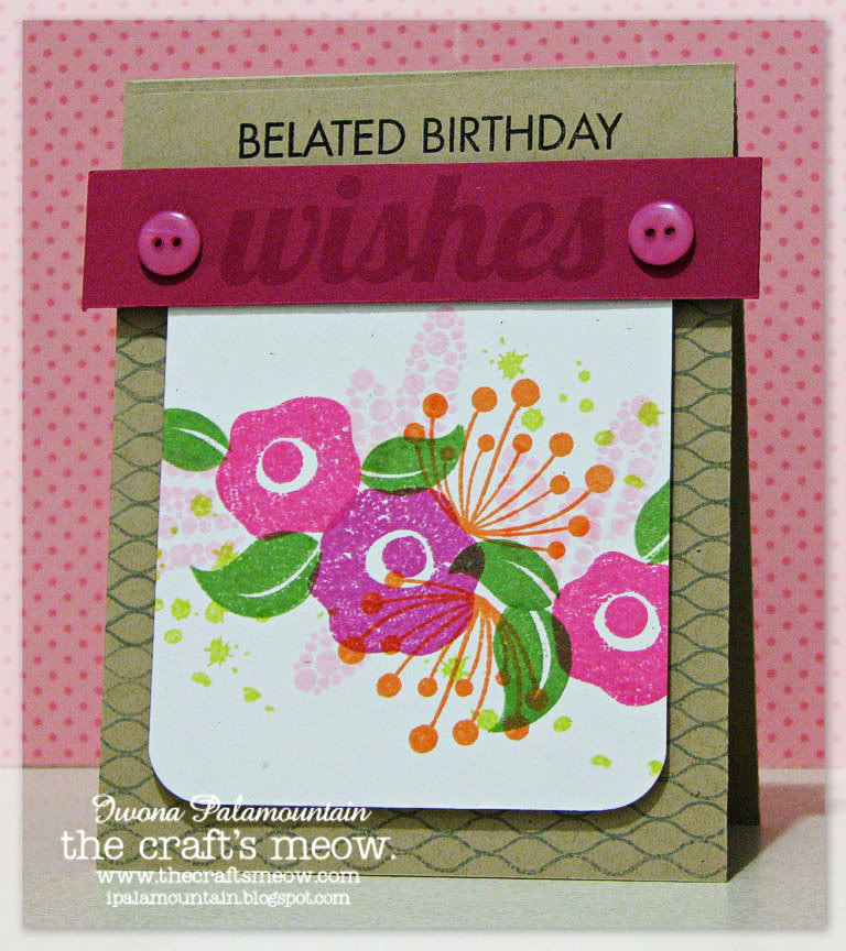 I used three of the brand new stamp sets from The Craft’s Meow. The flower was built with the blooms from the Flower Garden, stamped four times (in Memento Paris Dusk, Bahama Blue, Lady Bug and Rich Cocoa) around the circular space in which I placed a fabric brad.