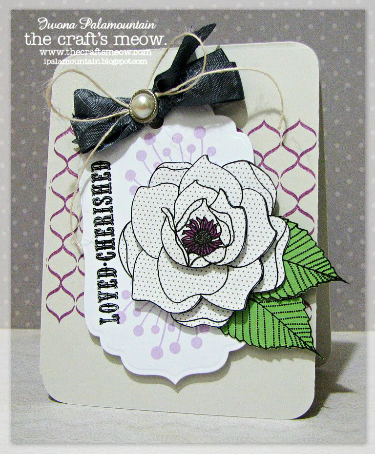 I used a number of sets on this card, including Retro Foundations, which I used to stamp the background; Beautiful Spring for my paper pieced flower and leaves (with the Kaisercraft polka dot paper); Flower Garden for the funky flowers stamped behind the big one; and finally Cherished that I took the sentiment from.