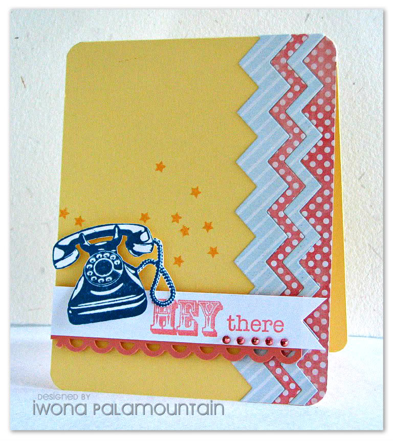I stamped the telephone from Hero Arts Vintage stamp set, in Memento Teal Zeal and cut it out. The sentiment is from PTI Say It With Style set, and it was stamped in Versa Magic Pink Grapefruit. I added a punched border to the banner and some Kaisercraft rhinestones unter the sentiment.