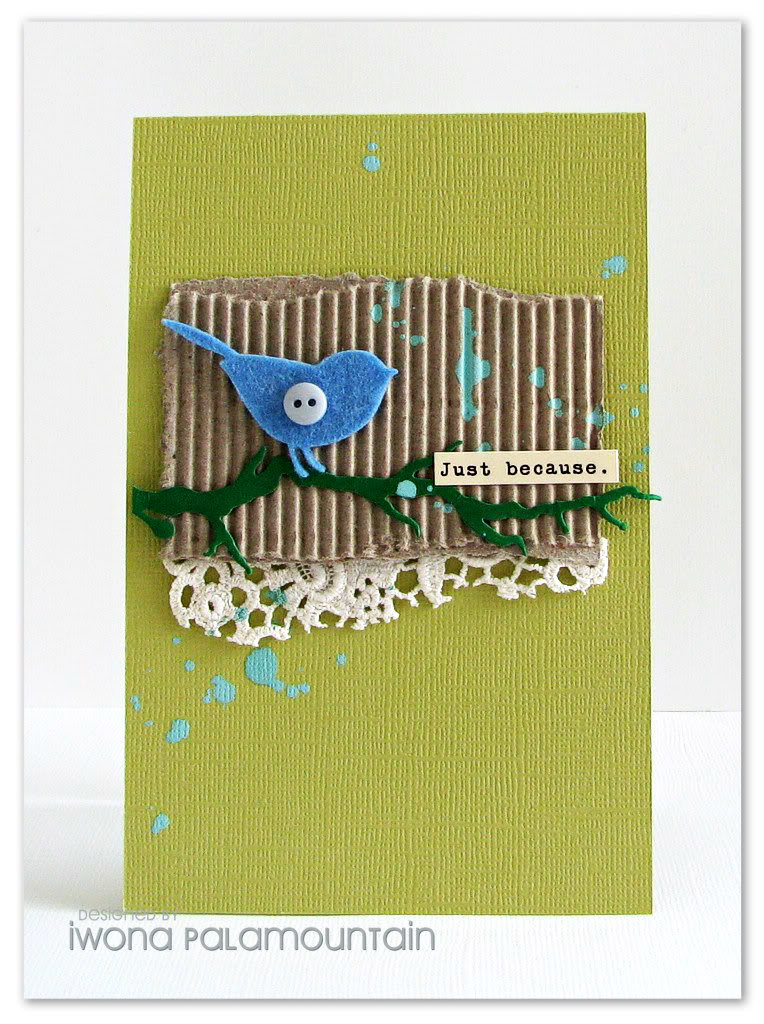 I usually restrict myself to one-two elements that elevate the design but I wanted to go hardcore this time and use all the goodies Julia used: corrugated cardboard, felt, crocheted lace. I took it even further, by adding splotches of ink, something that I admit to being slightly crazy about these days
