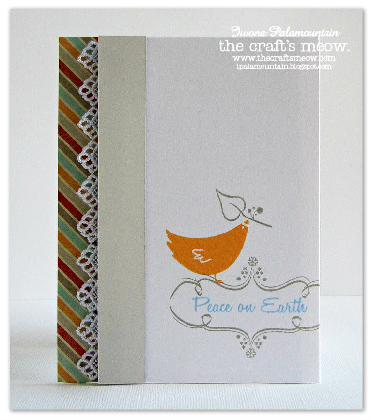 O Christmas Tree is full of trendy tree designs, with a couple of stamps to help accessorize them and great sentiments as well. I used three of the trees here, stamped tone in tone on SU! Certainly Celery CS. The middle one was embellished with a stamped star and a rhinestone, and I added the sentiment in red, to match.