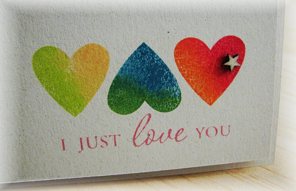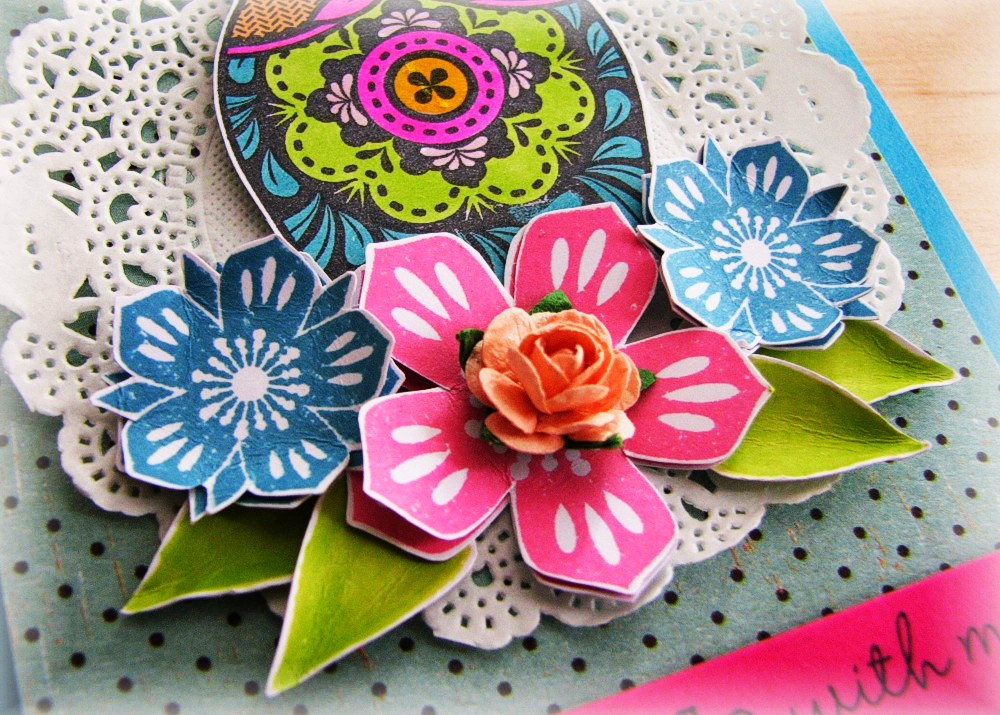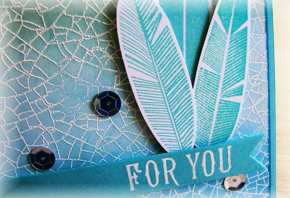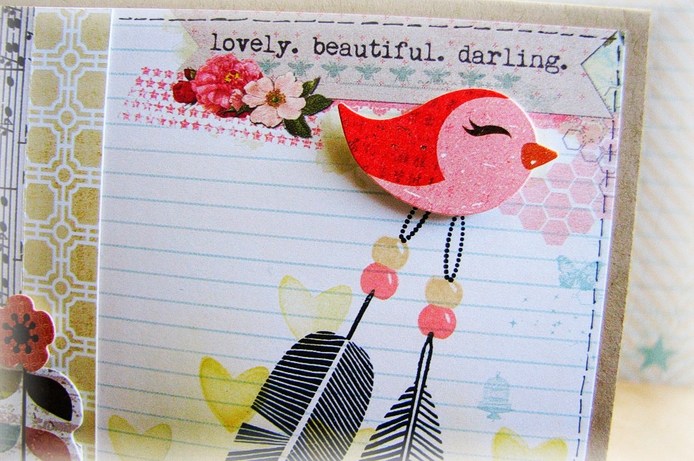First card features the awesome Funky Feathers, which I stamped on patterned paper and combined with lots of die cuts and whatnot, for an eclectic look. I sponged some light yellow ink behind the feathers, plus added some stamped hearts, creating a nice bokeh effect. The sentiment from the same set, was stamped on a tag die cut.