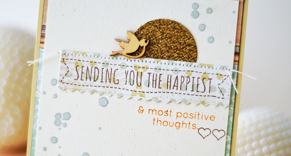 It’s so fantastically girly and charming, and airy. I had that ‘fresh and airy’ bit especially in mind, when creating my card. Aside from the colours, I opted for the slightly messy look and wanted to evoke a sense of freedom. The cluster of elements is meant to represent the bird, flying up into the sky with the sun behind him. What do you think?