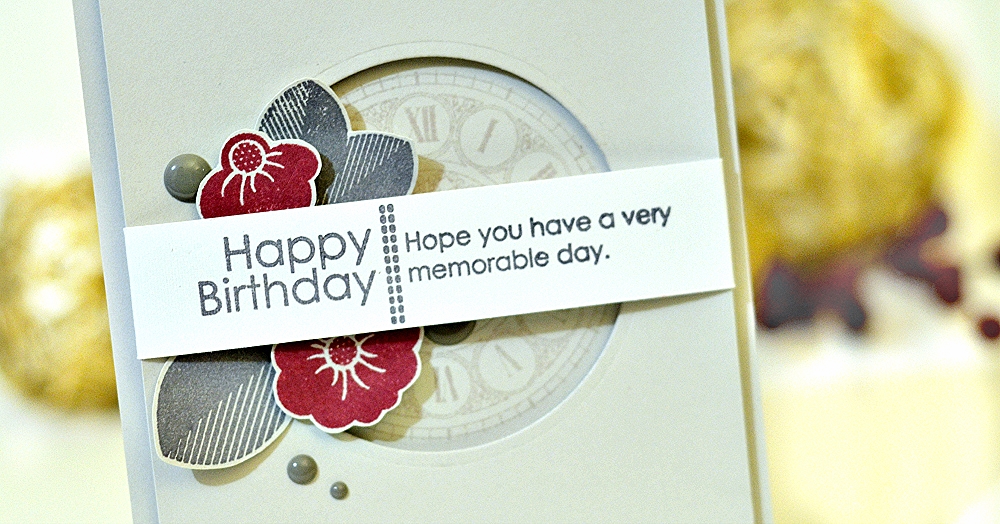 I die cut a window in a Soft Stone panel and stamped the clock face inside and on the base layer, in Soft Stone ink. Then I stamped and fussy cut the flowers and foliage from Ruby Rose, and tucked the elements under the sentiment strip stamped with Side By Side Sentiments. I won’t lie by saying that the last set waited for well over half a year to see ink!