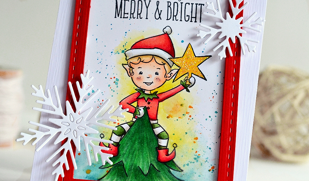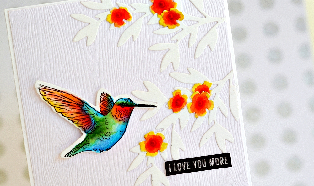 This card below you would’ve seen a sneak peek of on my Instagram. I’ve been itching to colour the hummingbird from Flora & Fauna 2 and so I did, using my Peerless watercolours (turned out a quick job, nothing too spectacular in therms of colouring I’m afraid) and after having it die cut with a corresponding die. I paired the bird with the branches, die cut with Foliage Frame Die (separate branch only) and the tiny flowers from Birds & Branches Frame Die. The latter I watercoloured as well, channeling my inner Teamie Joni *wink*